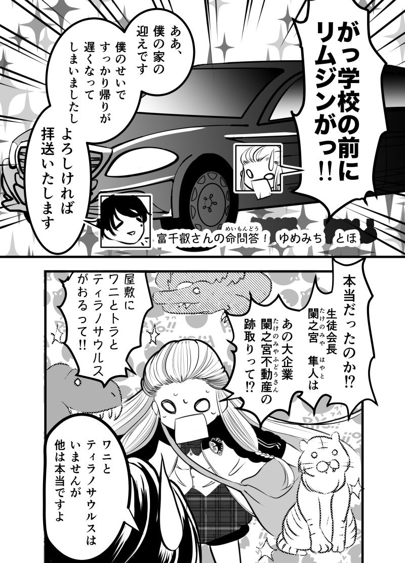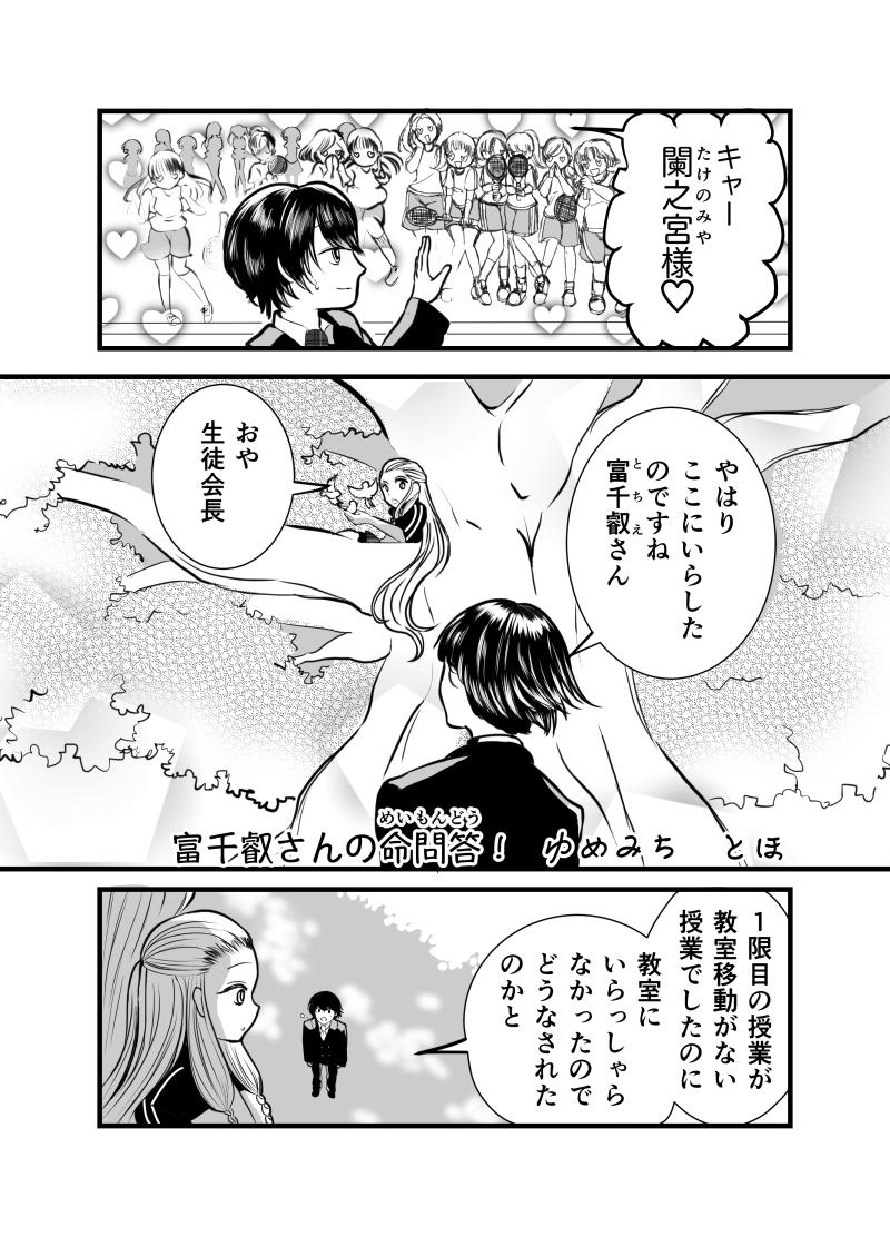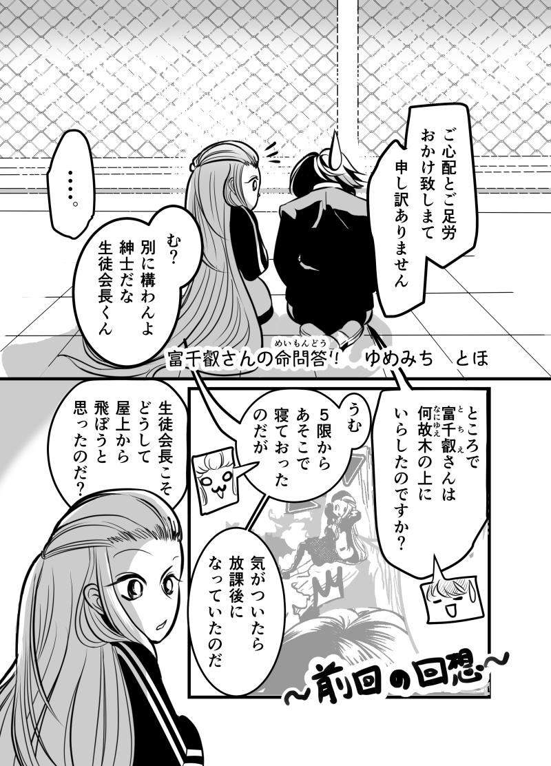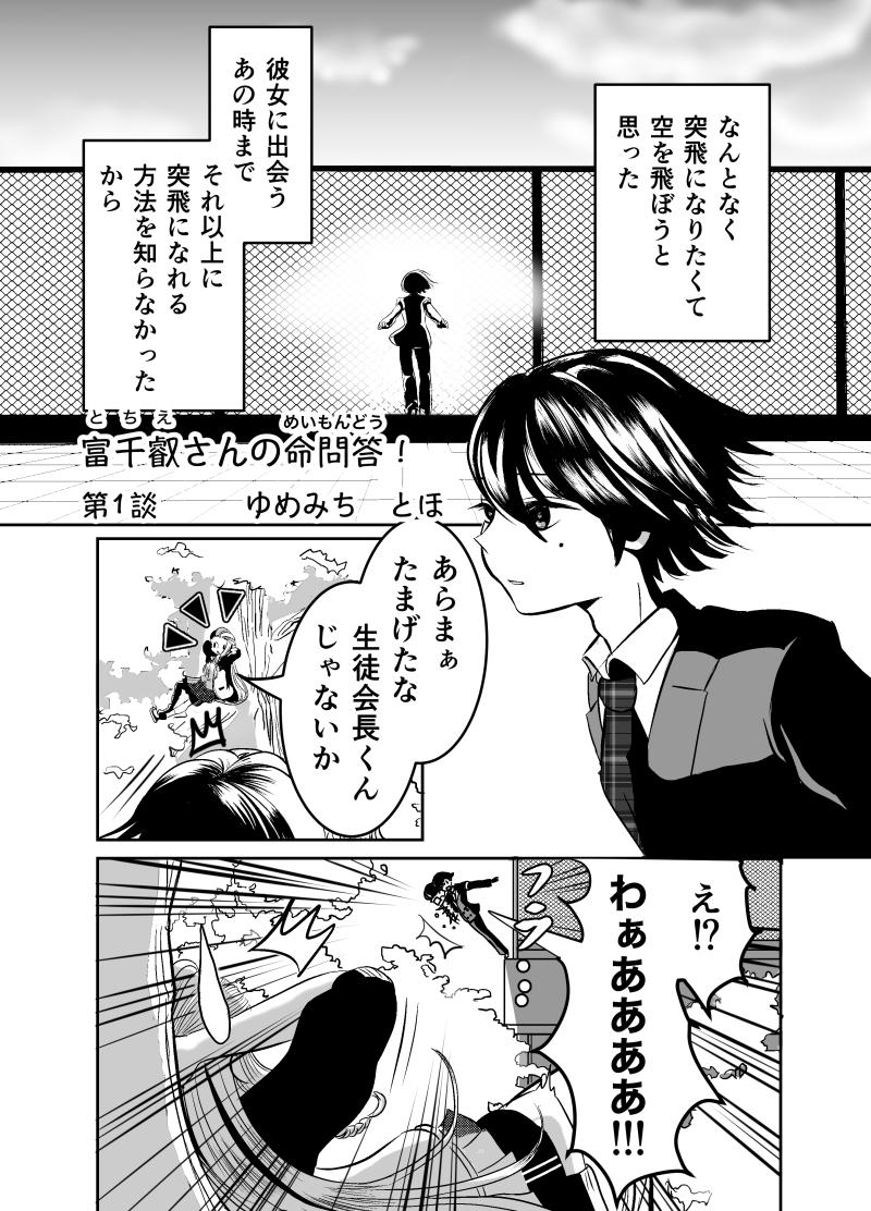 閲覧ありがとうございます!はじめまして、ゆめみち とほと申します。 さて、「富千叡さんの命問答!」いかがでしたでしょうか? 作品説明にも書かせて頂きました通り、この作品6月からツイッターで4ページずつ投稿しているもので、一話目は6月分の総集編となっております。 もうほとほと好みの女の子を描きなぐっている作品で、皆様にも少しでも 「富千叡さん、嫌いじゃないな」「こんな子好きだな」と思っていただければ、至極幸せです。ゆっくりではありますが、一生懸命描いていきますので、どうぞよろしくお願いします。