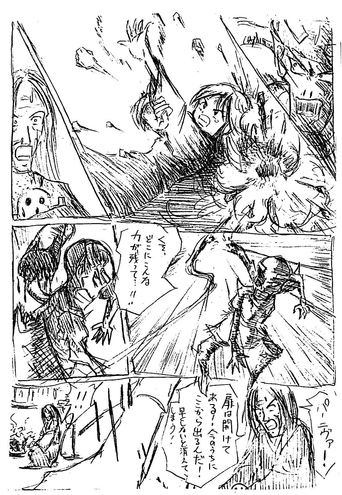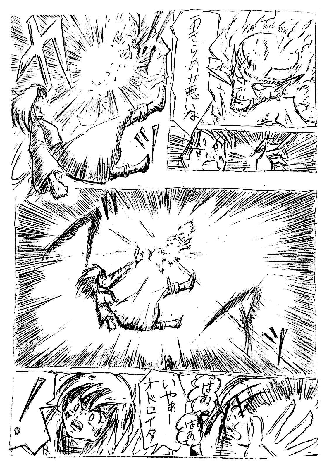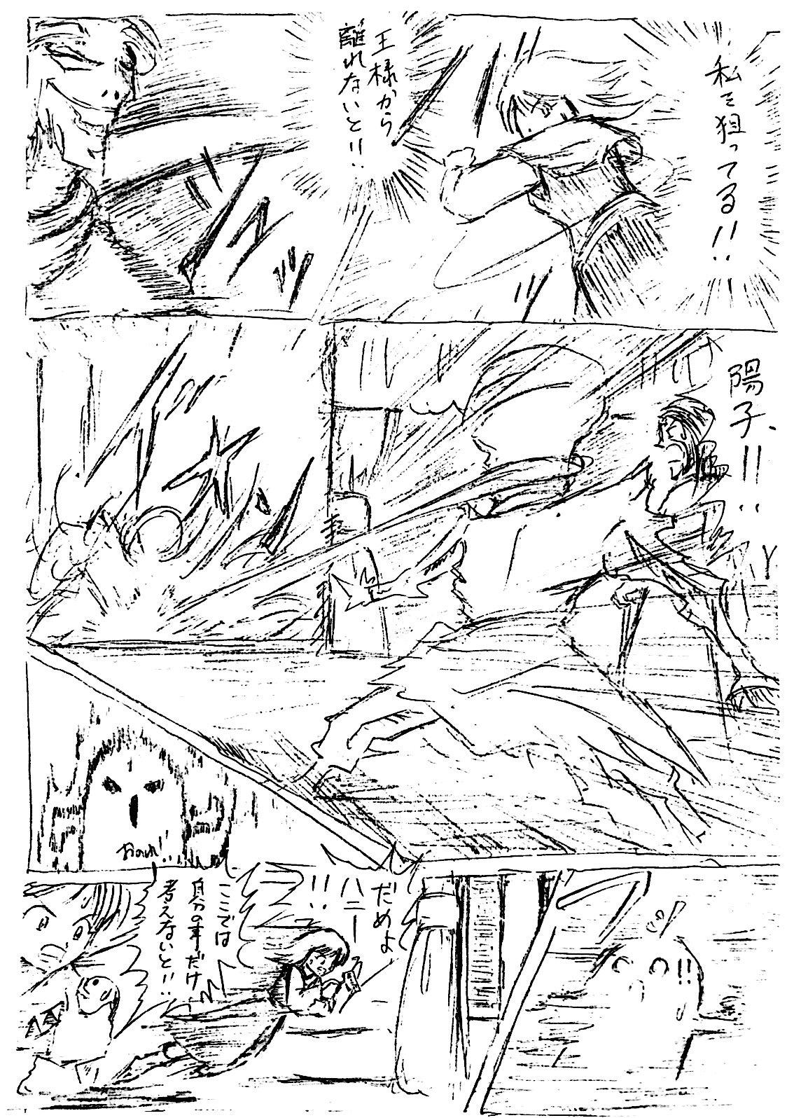 最初みんなでゆるく始めた流れで、この頃はまだこの手のシーンでもフリーハンド効果線ですが、だんだん定規を使った方が描く時間が短くなる内容になり、定規解禁していきますw