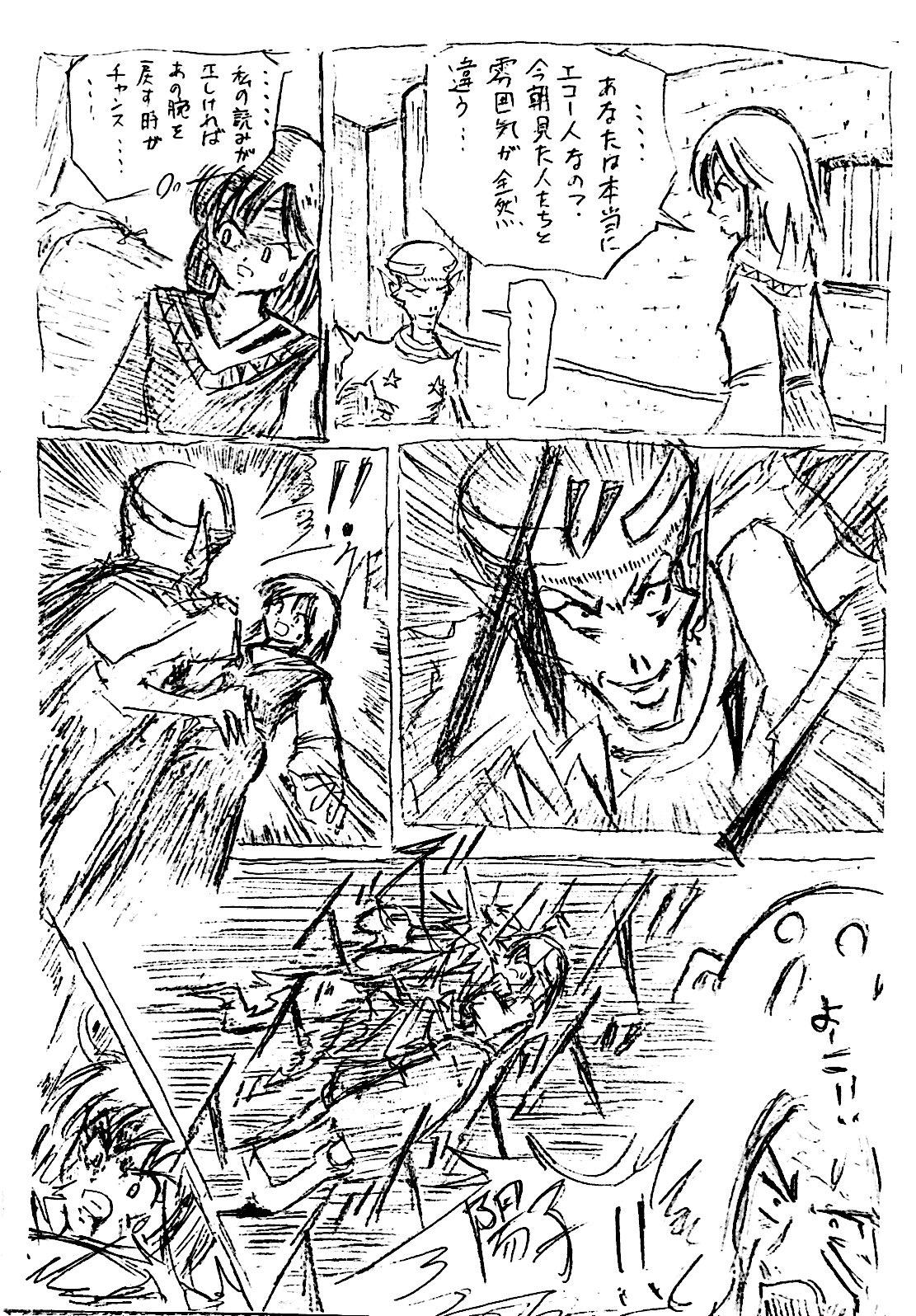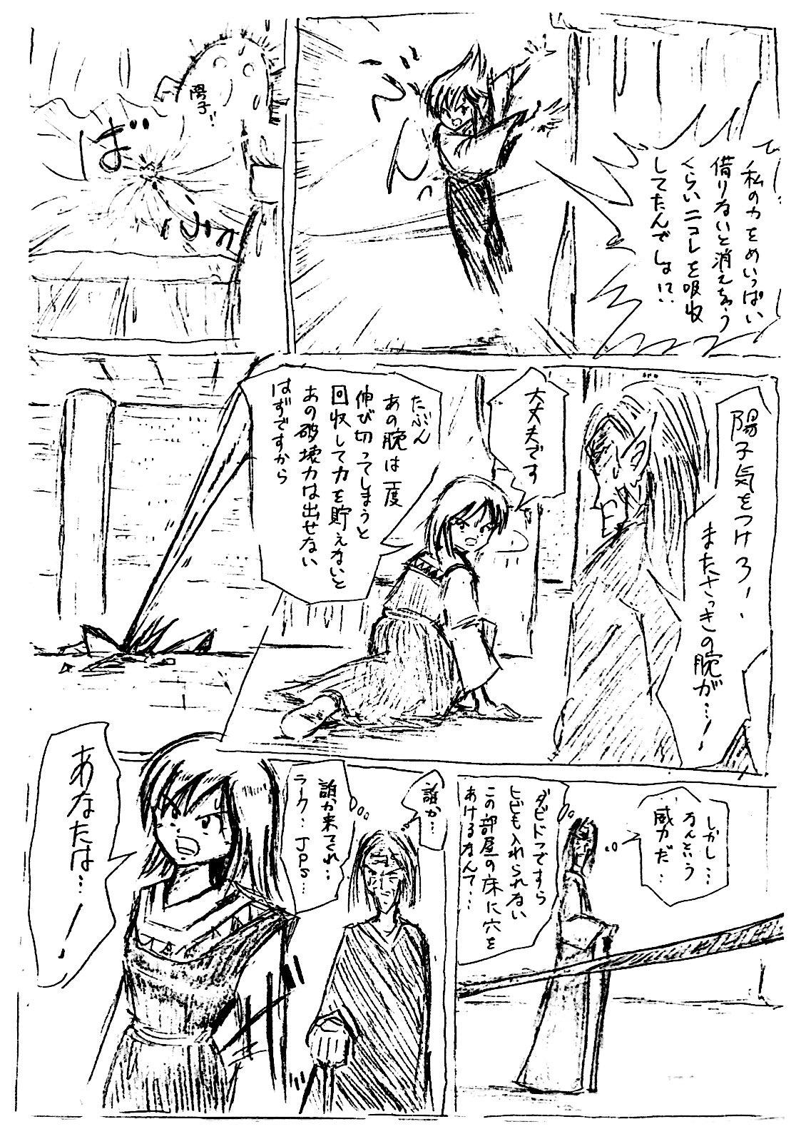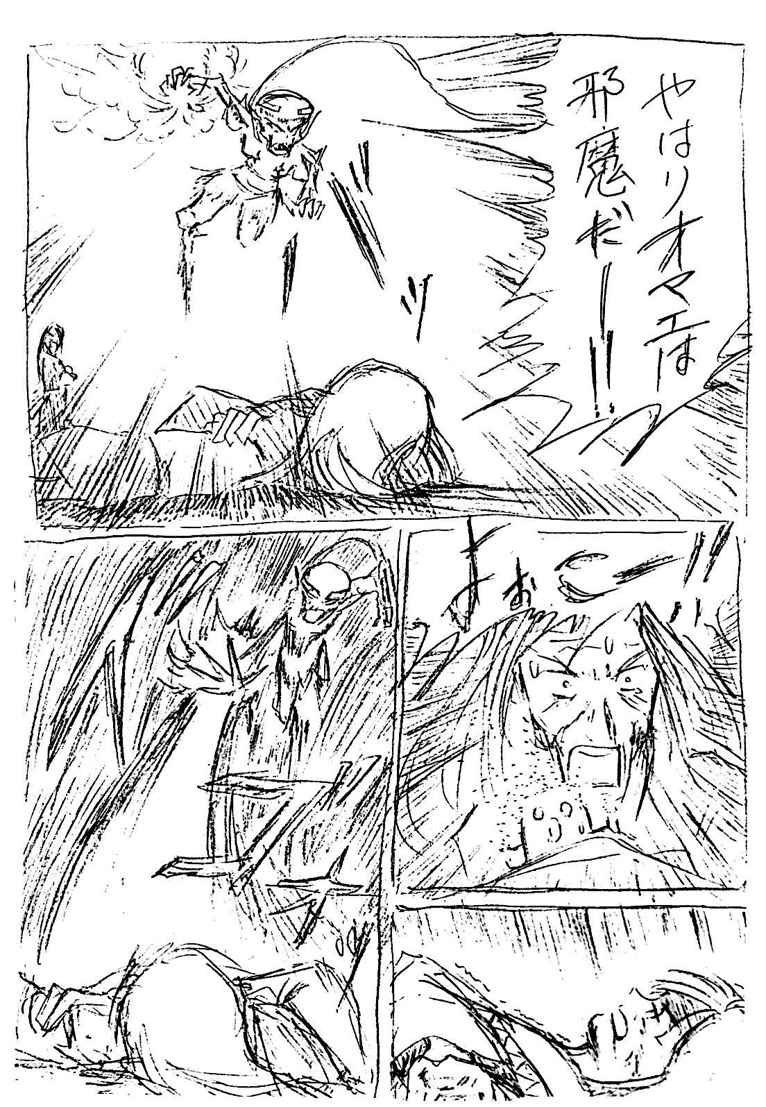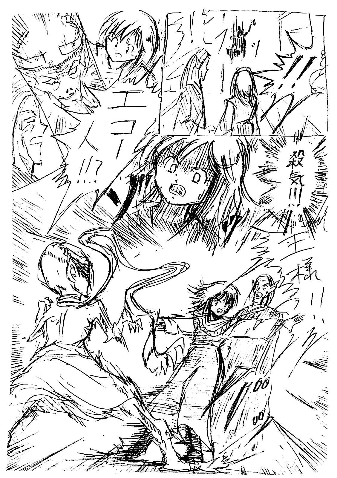 最初みんなでゆるく始めた流れで、この頃はまだこの手のシーンでもフリーハンド効果線ですが、だんだん定規を使った方が描く時間が短くなる内容になり、定規解禁していきますw