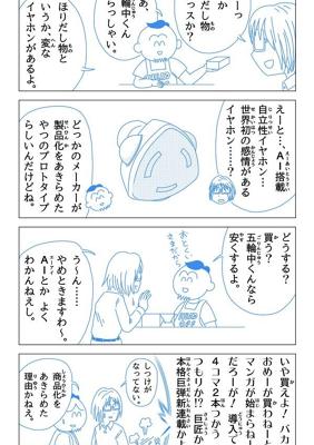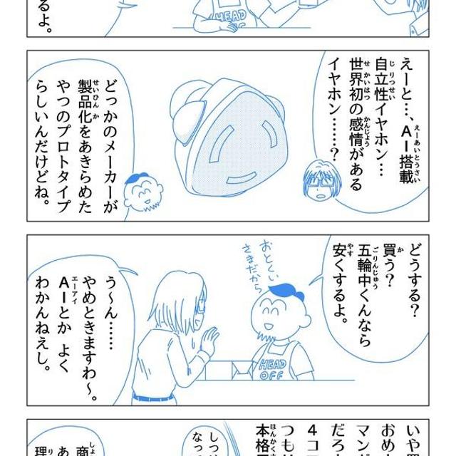 コロコロ次世代マンガGP 国民的マスコットキャラ賞 第一回 に応募して見事に落選した作品です。 AI 搭載で自我を持つイヤホンの4コマです。 続きを描く予定はありません。第1話で完結です。