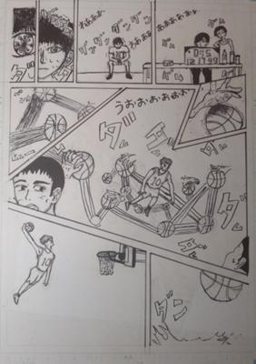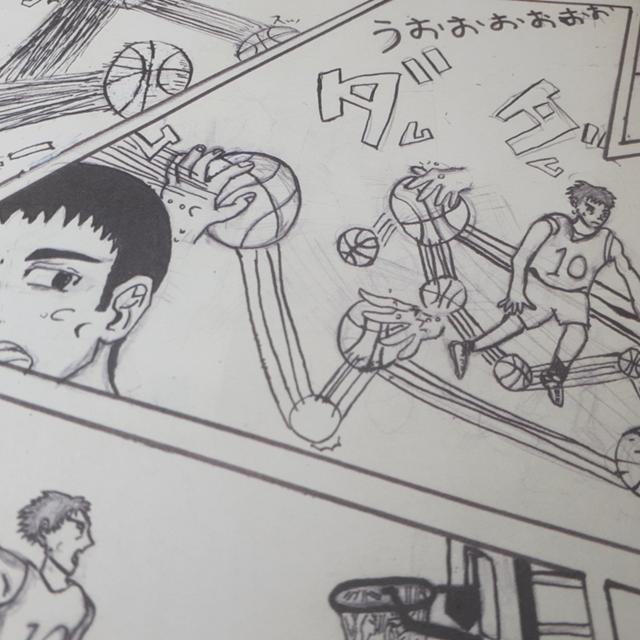 最初にドリブルの音が大きく、騒がしい感じで、ダムダムって鳴ってるんですけど、 その音が止んだとき、次は自分の心臓から、 もっと騒がしい音が流れて、観客たちは、 僕もドリブルあんな感じで頑張りたい! って思って、練習に励むって漫画を作りたくて 作りました!!