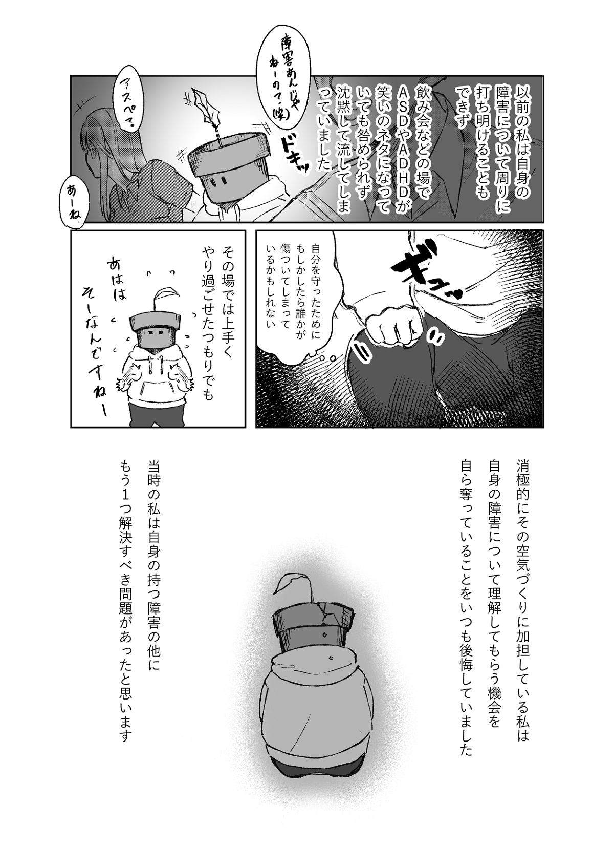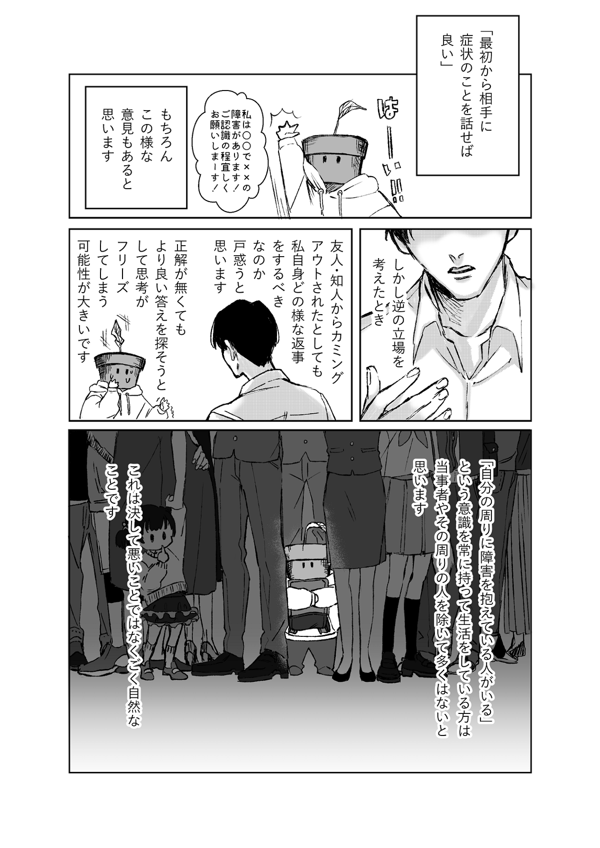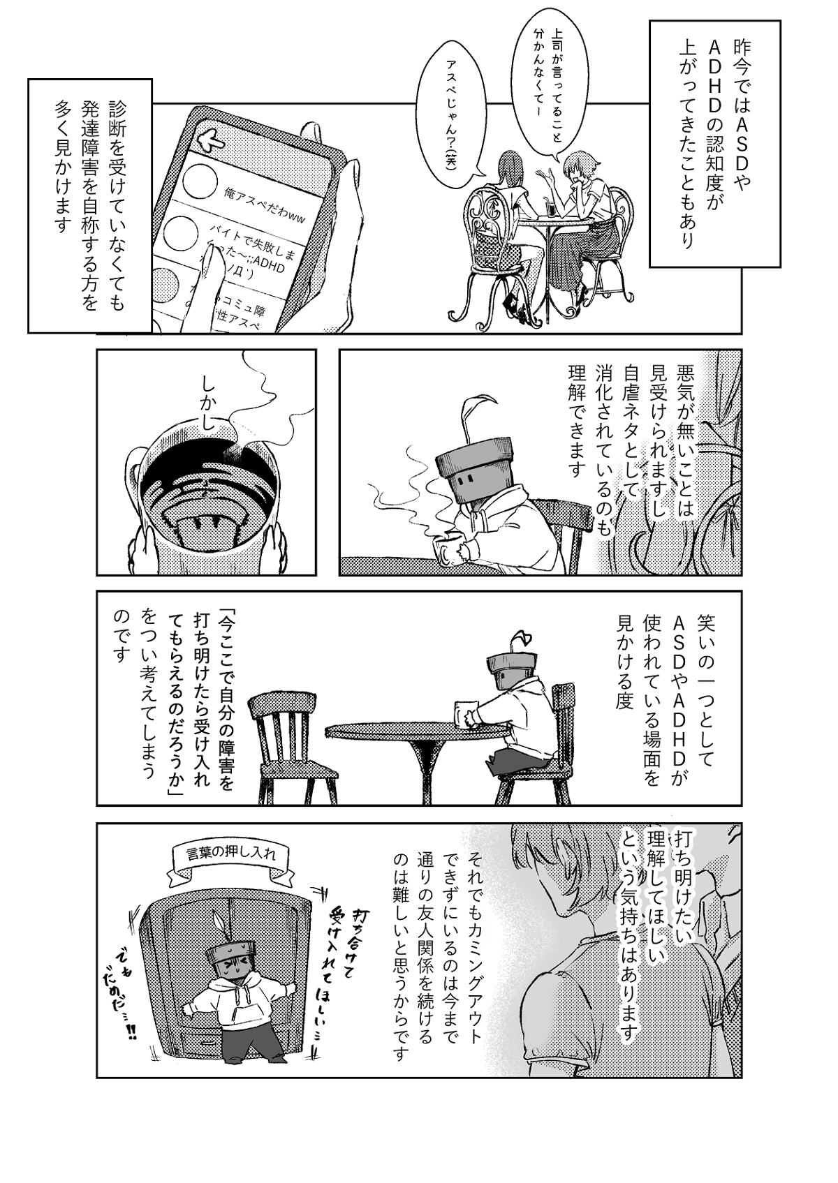 今は多少カミングアウトしやすくなったような気がします。と言っても私自身は家族以外に打ち明けているのは2~3人です。この症状について話すのは凄く勇気が要ります。