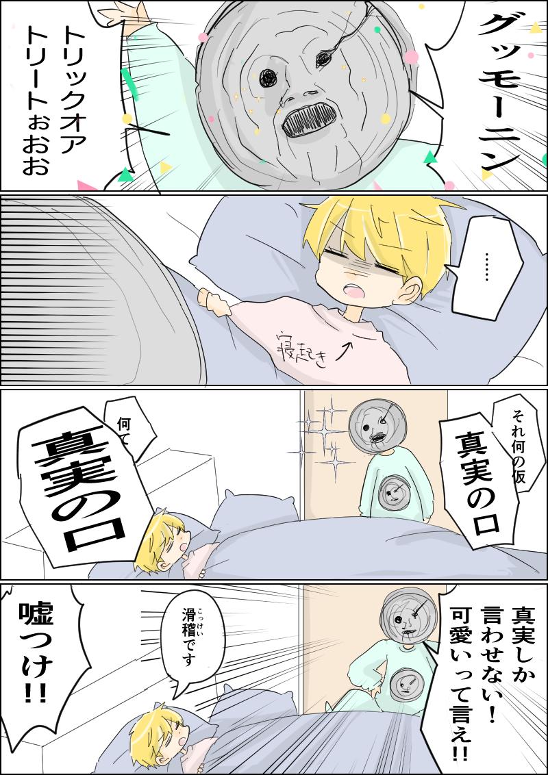 ハロウィン4コマ②「寝起きTrick」 真実の口は多分お面というよりはメット型と思われる。天音くんはいつでも全力!